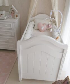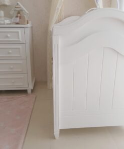 Em estilo clássico romântico, é um lindo conjunto, com espessuras grossas e bem reforçado, desenhos usinados que deixam o berço e a comoda ainda mais lindos, o berço também vira mini cama e você usa até 5 aninhos de idade!